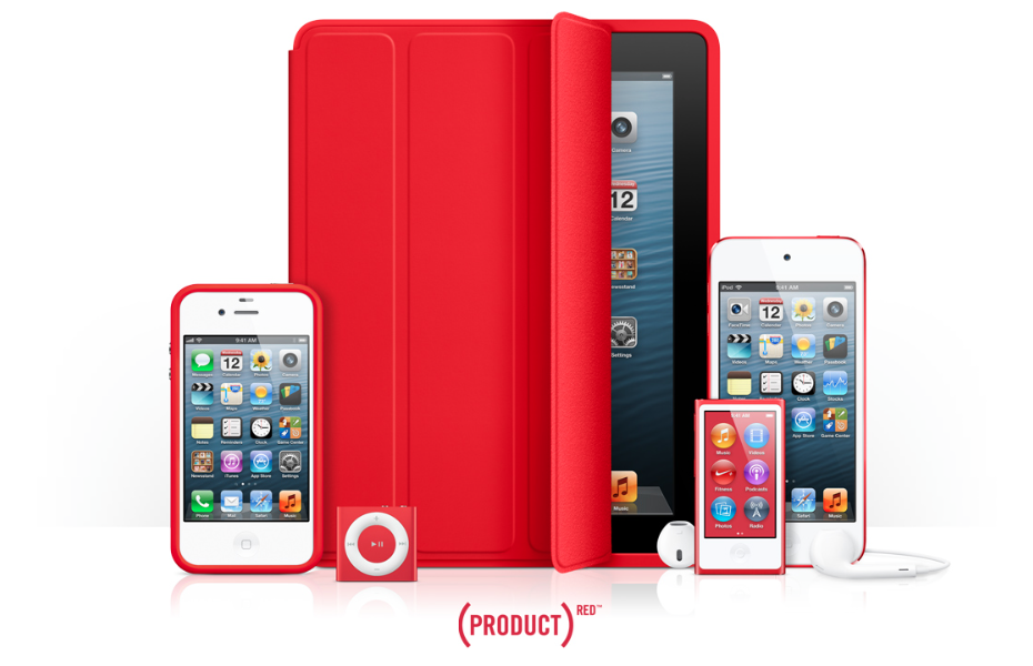 Первым продуктом компании Аpple. который получил статус благотворительности в 2006, стал — iPod nano (Product) RED Special Edition красного цвета. На благотворительность шли 10 долларов от продажи каждой модели. С тех пор, в акции участвовали: плееры iPod nano, iPod shuffle и iPod touch, подарочные карты, Smart Cover для iPad и Bumper для iPhone.