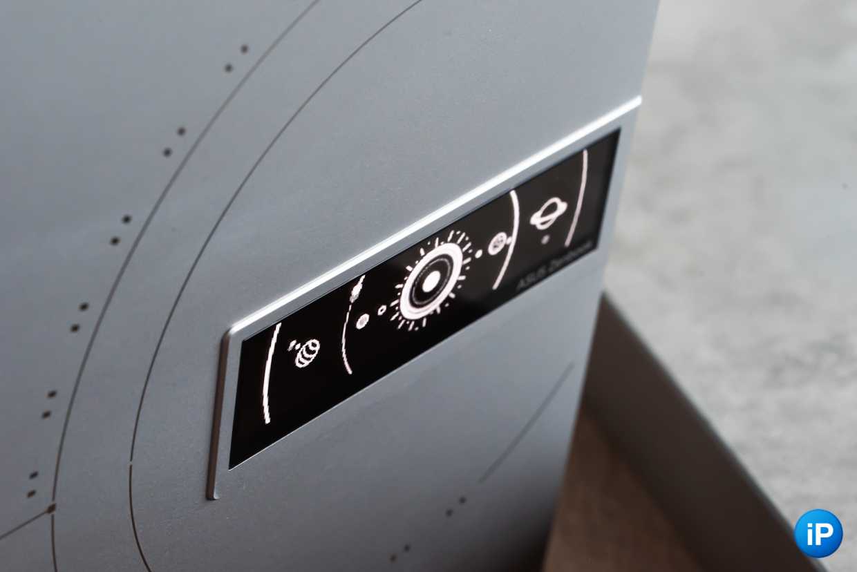 Оформление у новинки действительно космическое, во всяком случае, узнаваемость у ноутбука будет стопроцентной. Корпус получил приятную фактуру и декор на панелях в виде той самой орбитальной станции, на которой проработал долгое время первый космический ноутбук ASUS. При этом в декоре точками и тире (азбука Морзе) выгравировали фразу через тернии к звёздам (Ad Astra Per Aspera). Да и других пасхалок там много на разных рисунках, скрытых панелях и на рабочем столе, на заставке.