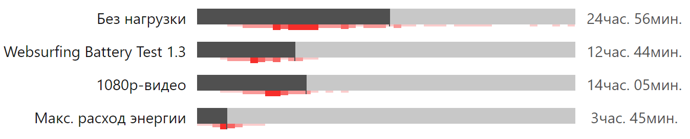 На портале NotebookCheck провели тесты при яркости экрана 150 кд/м² (около 30%) в режиме просто включенного экрана без нагрузки, в тесте веб-серфинга с использованием Wi-Fi, в режиме воспроизведения видео без интернета и с максимальной яркостью экрана при полной нагрузке.