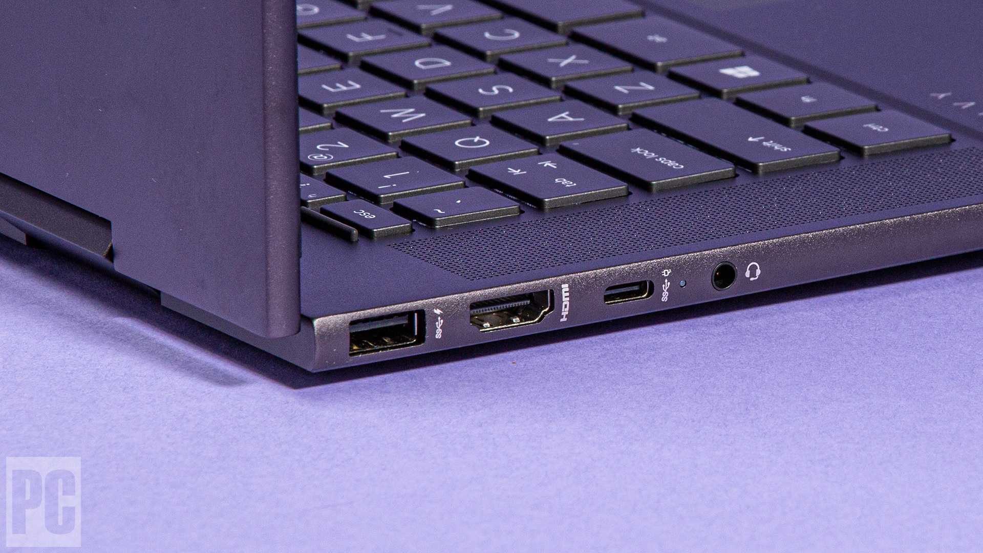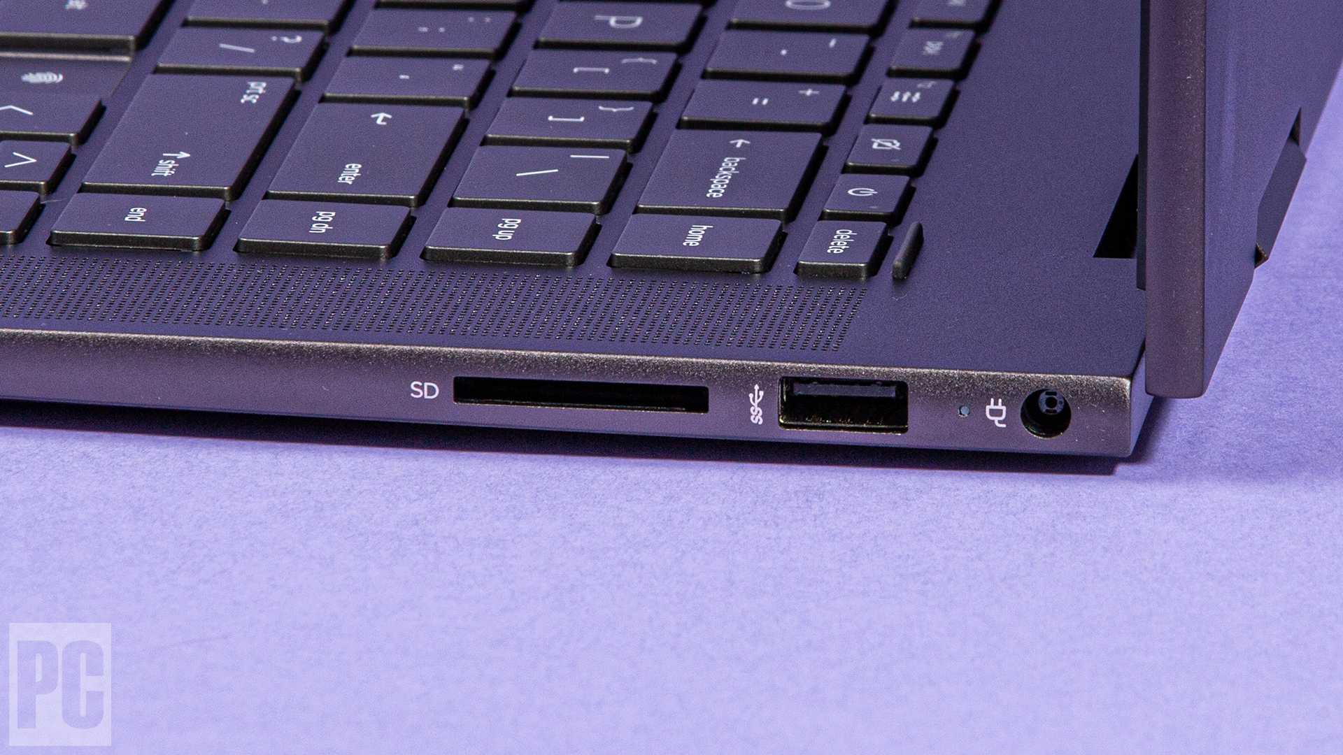 Ноутбук имеет три порта USB 3.2 Gen 2 (10 Гбит / с) — порт Type-A с обеих сторон (тот, что слева, всегда включен для зарядки смартфона), и порт Type-C слева. На левом краю также находятся видеовыход HDMI и аудиоразъем, а правый — слот для SD-карты и разъем адаптера переменного тока.