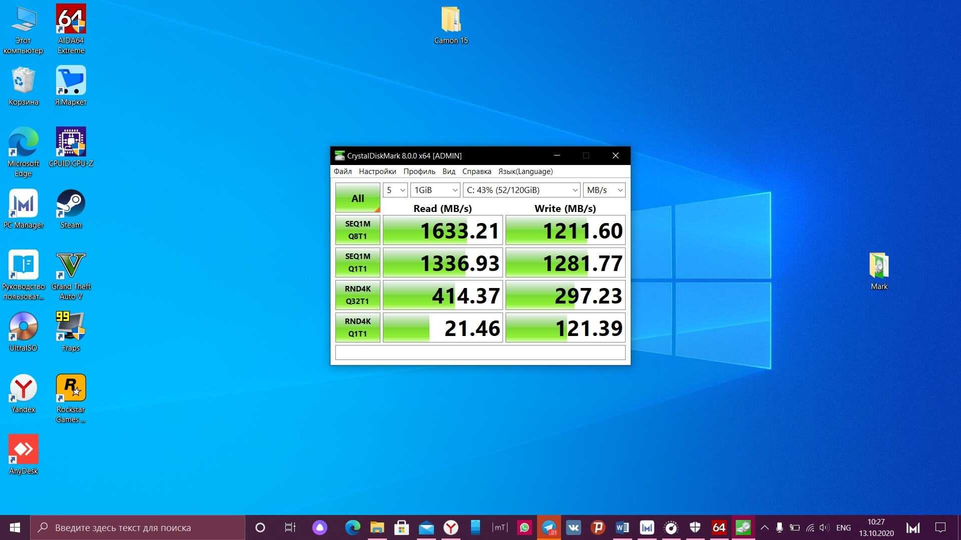 Скорость записи диска в CrystalDiskMark была оценена в 1633 МБ/с, а чтения в 1211 МБ/с, что выглядит вполне достойно для такого типа SSD. Можно вообще не беспокоиться о том, что ближайшем будущем понадобится замена ультрабука или комплектующих. Все процессы операционной системы работают очень быстро.
