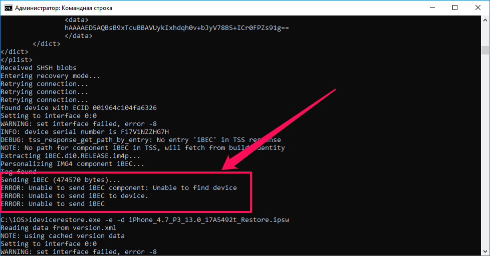 Например, если название IPSW-файла «iPhone_4.7_P3_13.0_17A5492t_Restore», то команда для успешной установки iOS 13 будет выглядеть так: