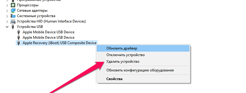 Шаг 8. Запустите «Диспетчер устройств», выберите пункт «Устройства USB» и нажмите правой кнопкой на Apple Recovery (iBoot) USB Composite Device. Выберите «Удалить устройство». Если откроется всплывающее окно с возможность поставить галочку — поставьте ее и подтвердите удаление.