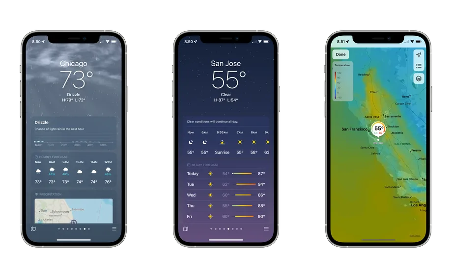 Помимо карт, интересную визуализацию получило и приложение погоды. После того, как Apple купила Dark Sky, она взяла оттуда несколько интересных особенностей и перенесла в свое приложение. Теперь здесь есть градиентные полосы для температуры, новые уведомления об осадках на следующий час или день, карты температуры и осадков и т.д. Также добавлены новые анимации погоды, например, когда идет гроза, приложение сверкает молниями, а капли дождя вытекают из верхней части экрана и растекаются по краям.