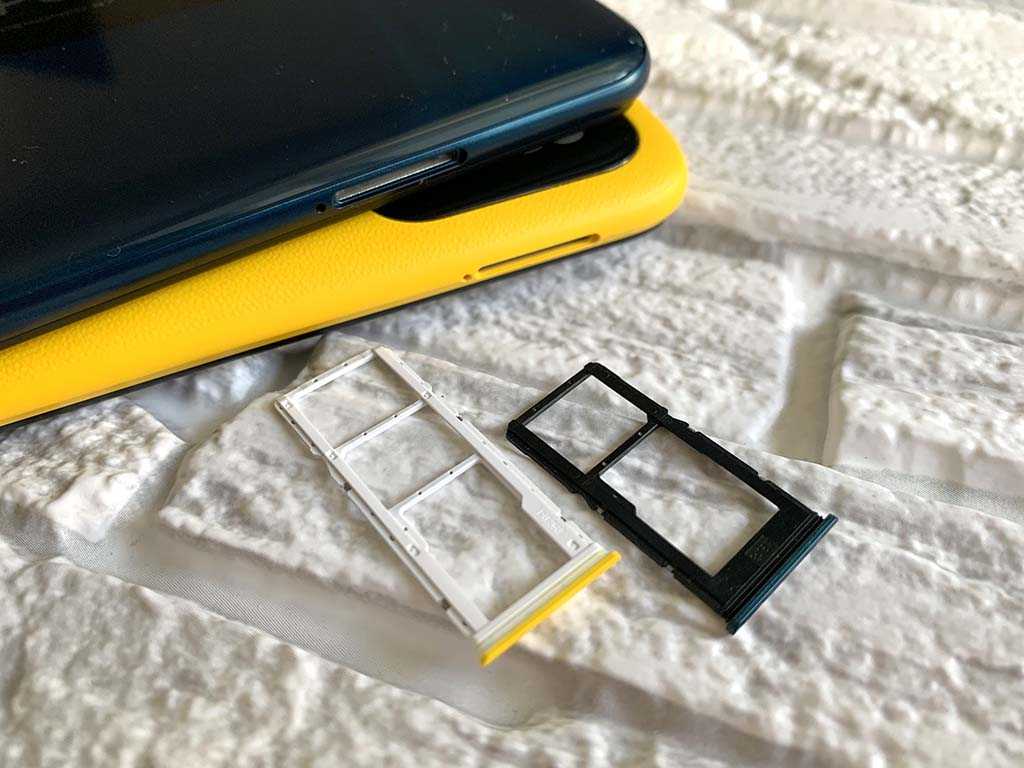 Сканер отпечатков пальцев расположен с правой стороны. Poco M3 также имеет слот для двух SIM-карт и карты памяти microSD. Это очень удобно.