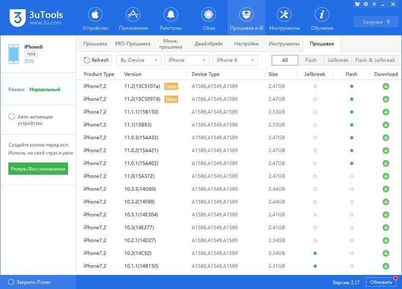 Во вкладке Прошивка находятся все варианты прошивок для iOS. Пользователю доступны сортировка по версиям и моделям устройства с последующим выбором нужного варианта и загрузкой на персональный компьютер.