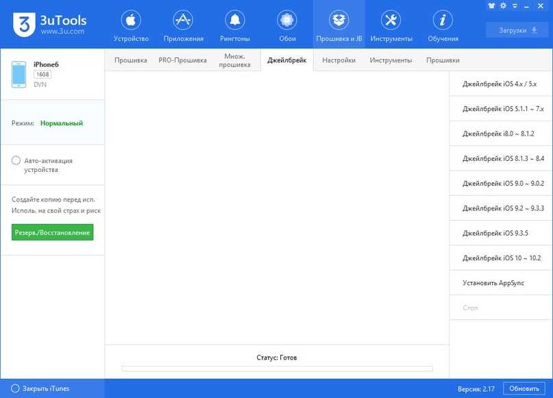 Джейлбрейк и прошивка — вкладка, переназначенная для помощи пользователю в прошивке, понижению версии, получению обновлений и джейлбрейка на телефон.