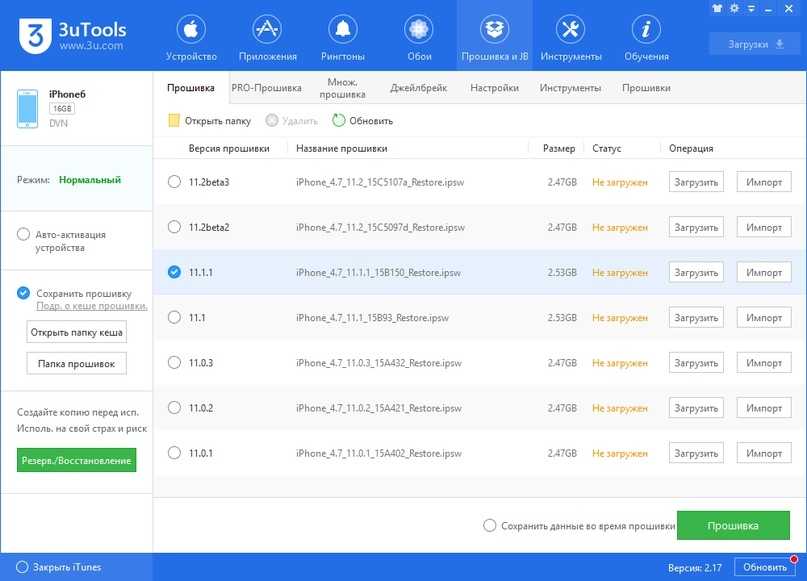 Инструмент Прошивки рассчитан на простую операцию. Здесь (при условии активного подключения к 3uTools) выводится оптимальная версия прошивки под ваше устройство. Самостоятельно выбирать ничего не нужно. Программа сама назначит какую прошивку следует подгрузить и установить.