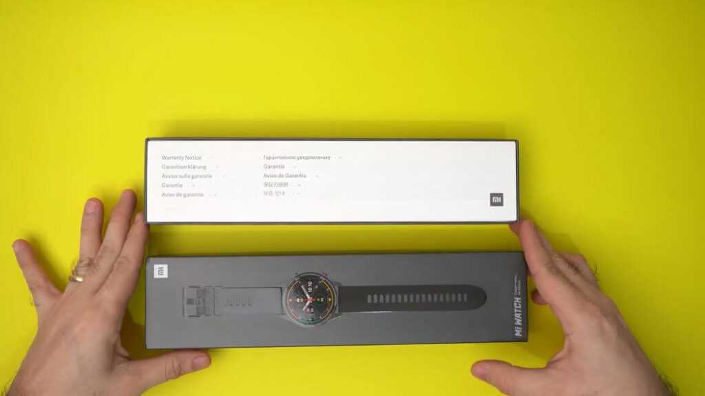 Глобальная версия Xiaomi Mi Watch поставляется почти в той же коробке, что и китайская версия. Это длинная прямоугольная коробка с нарисованными на передней панели умными часами. У популярного бренда Apple такая же коробка со своими умными часами.