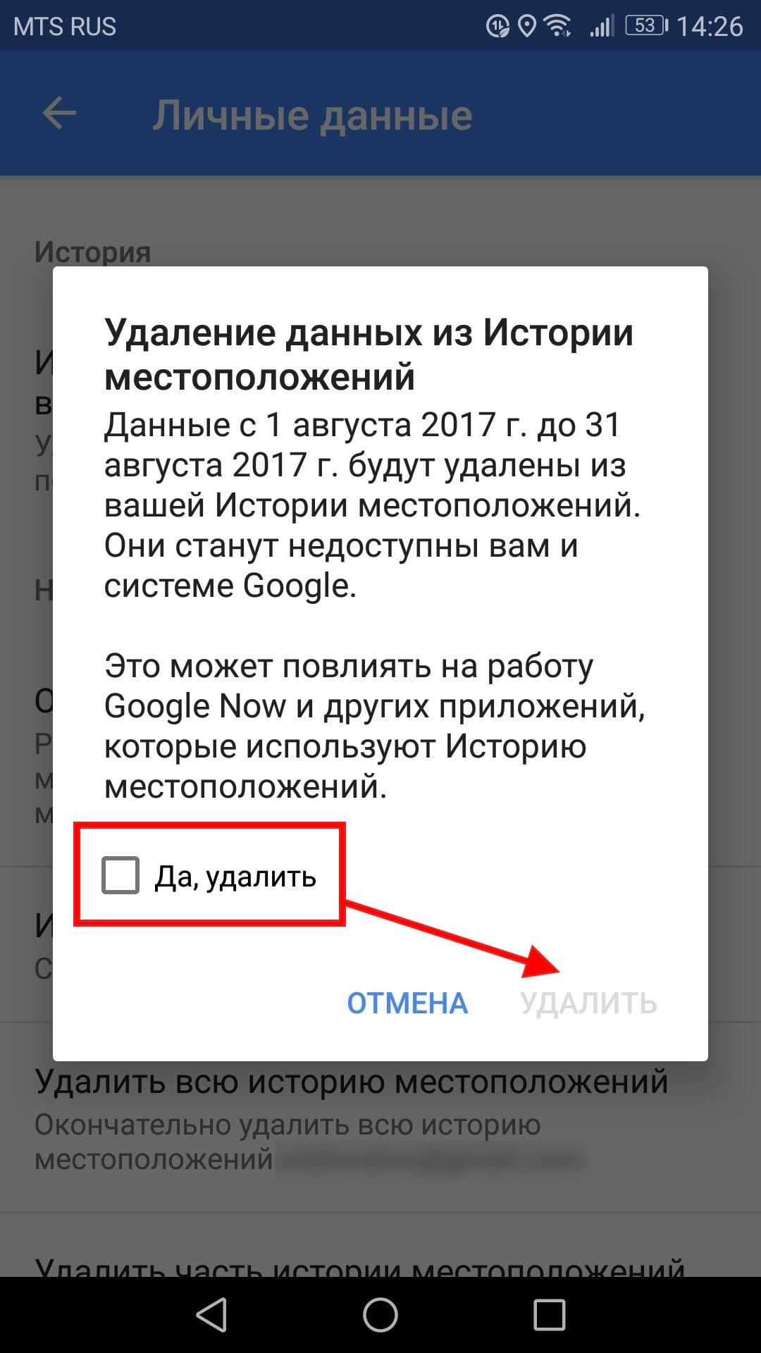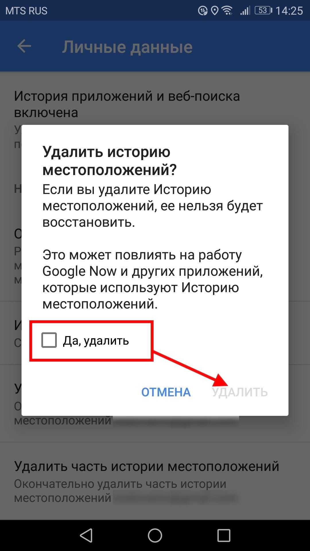 Чтобы удалить всю историю местоположений нажмите на этот пункт. Появится предупреждение о том, что это действие нельзя отменить, и это может повлиять на приложения, которые используют Вашу историю местоположений. Если Вы согласны, то поставьте галочку в поле «Да, удалить» и нажмите «Удалить».