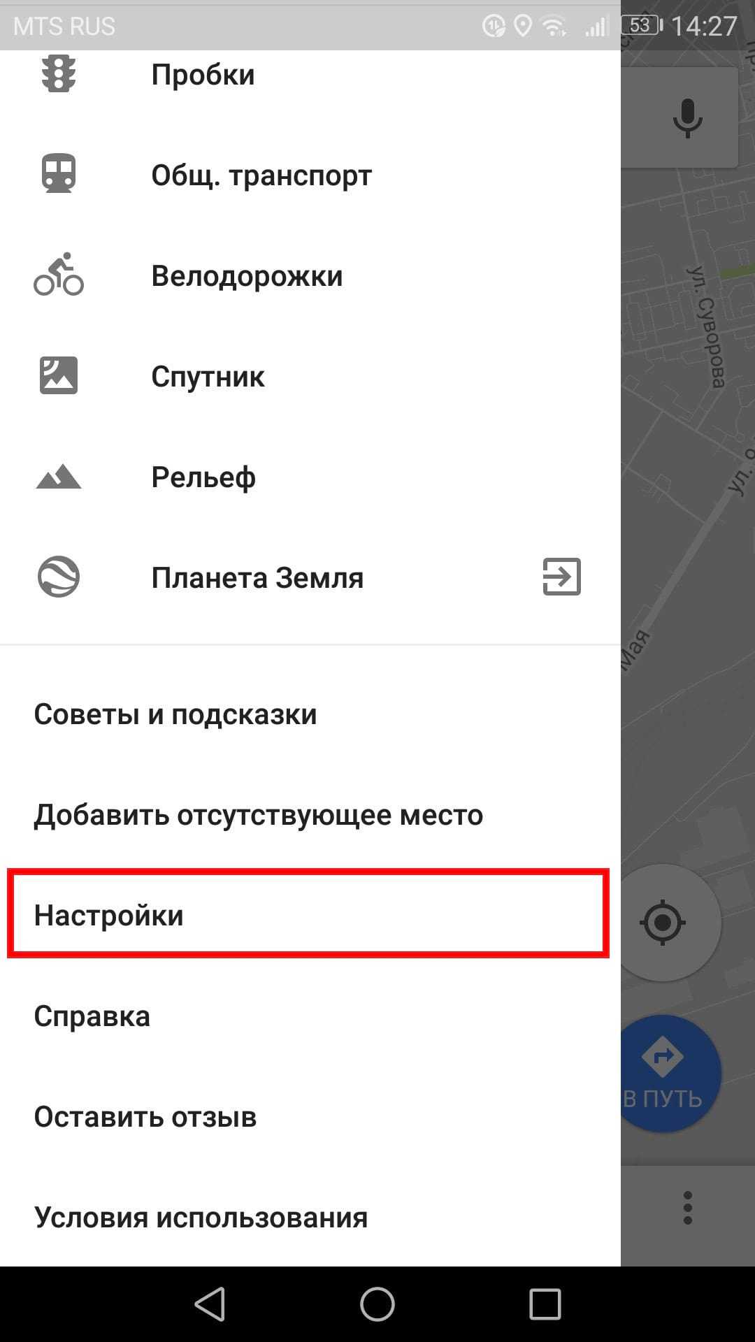 Сначала запустите Google Карты. Откройте меню, сделав свайп вправо или нажав три полоски в левом верхнем углу. Прокрутите меню вниз, там Вы увидите пункт «Настройки», нажмите на него.