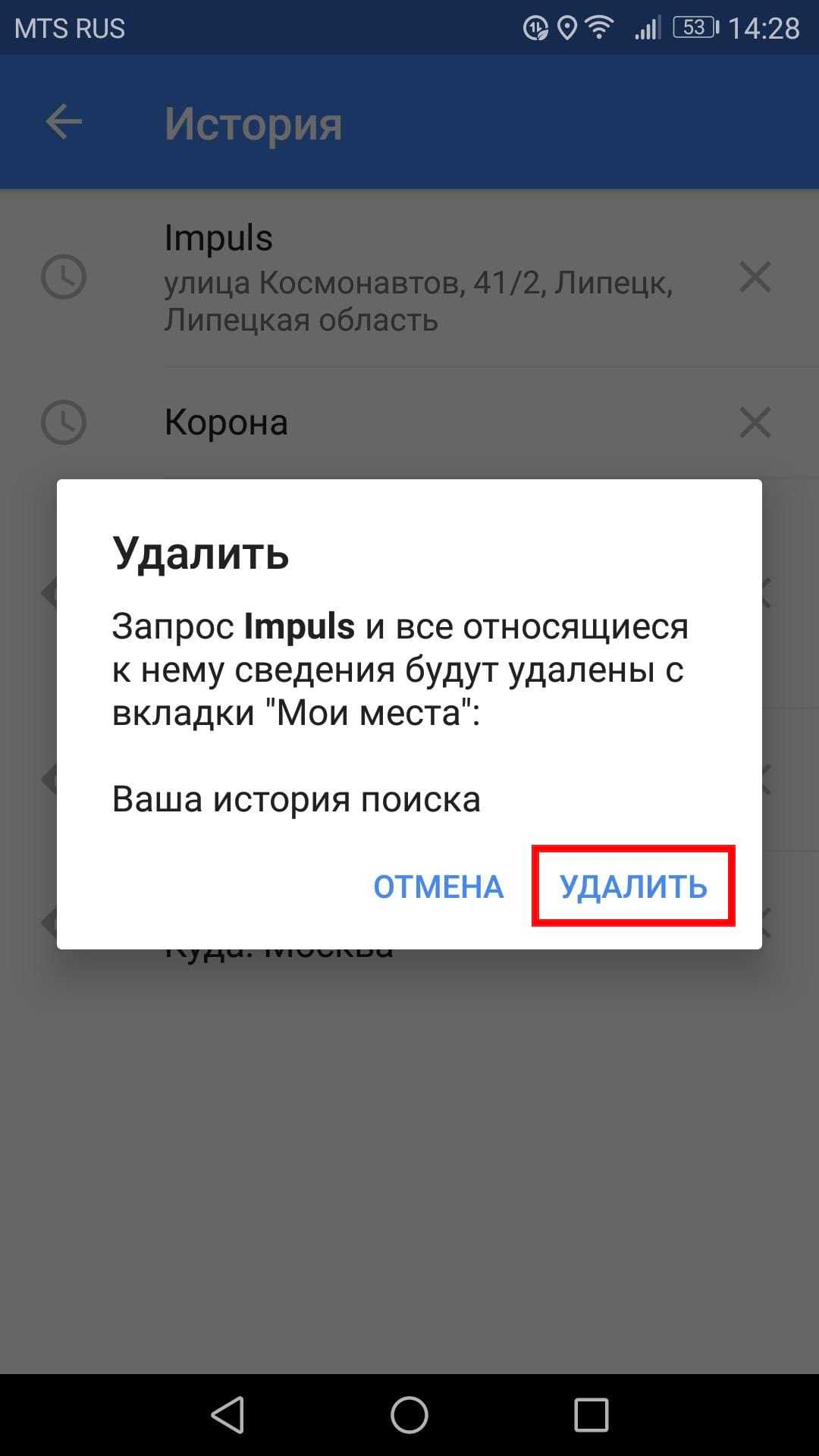 После нажатия на X Вы получите небольшое предупреждение о том, что эта запись будет удалена из истории Карт. Подтвердите удаление, нажав на кнопку «Удалить».