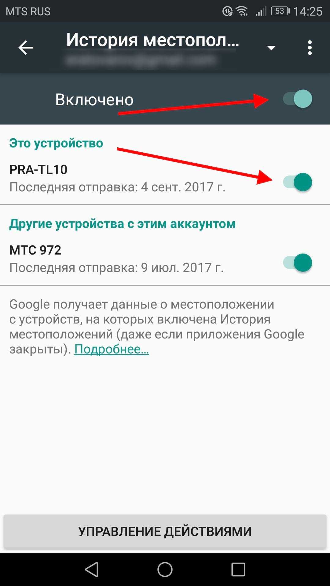 Вы можете отключить историю местоположений для конкретного устройства или совсем — просто нажмите соответствующий переключатель. Верхний переключатель отключит отслеживание истории местоположений на всех устройствах, а переключатель рядом с именем устройства просто отключит его на этом конкретном устройстве.