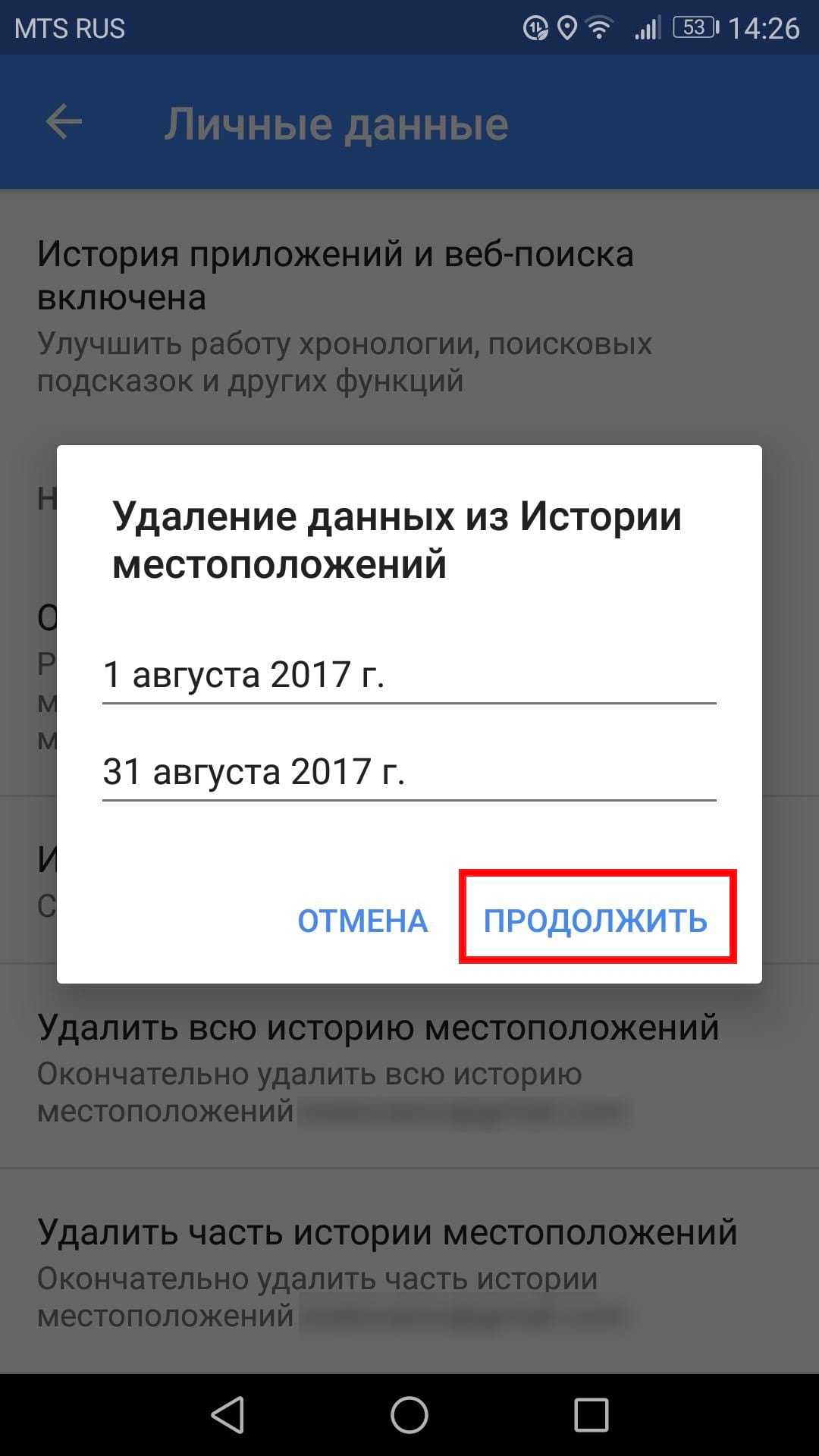 Если Вы хотите удалить историю местоположений только за период, то выберите пункт «Удалить часть истории местоположений». Укажите дату начала периода и дату окончания и нажмите «Продолжить».