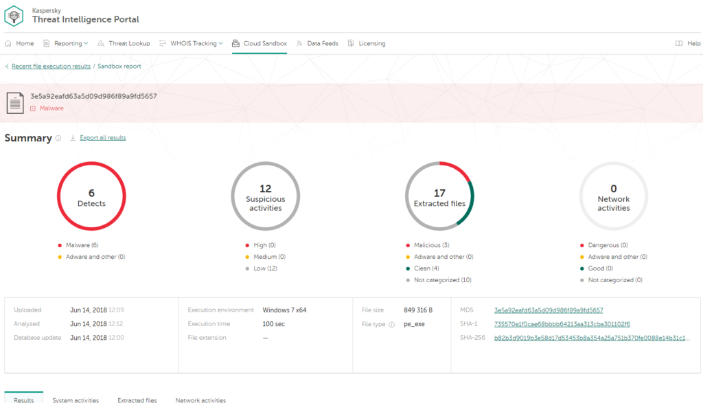Портал Kaspersky Threat Intelligence. Онлайн-сервис, пришедший на смену закрытой в апреле 2020 года популярной программе Kaspersky VirusDesk, позволяет онлайн-сканировать подозрительные объекты и большие файлы размером до 256 МБ в общем режиме.![]()