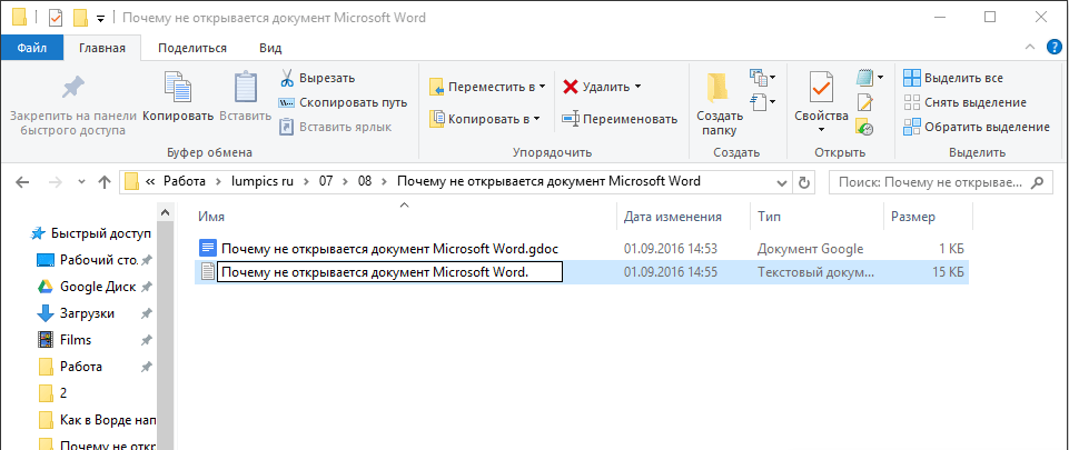 - Ищете в Проводнике поврежденный документ, но не открываете его, а выделяете, сделав один щелчок левой клавишей мыши.