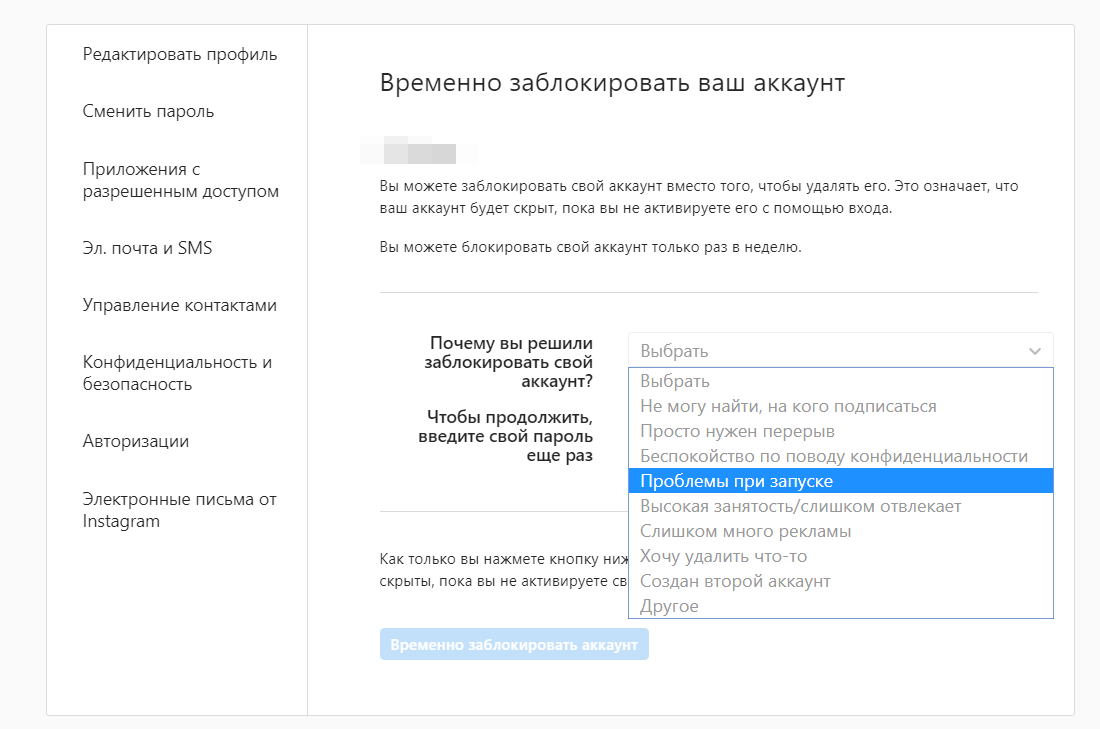 Запустить веб-версию Instagram (Instagram.com), авторизироваться в ней и зайти в настройки. Там отыскать опцию «Временно заблокировать мой аккаунт» и выбрать ее, нажав на строчку. В качестве причины нужно выбрать «проблемы со входом», после чего подтвердить свой запрос на временную блокировку и забыть о проблеме часа на 3. Из блокировки аккаунт возвращается с помощью логина. Неизвестно, что там происходит за эти три часа, но у подавляющего большинства пользователей проблема со входом в Instagram решилась именно этим способом.