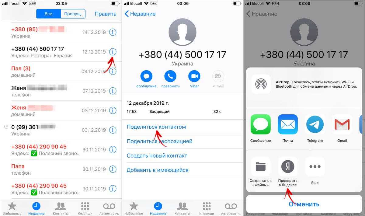 Кроме всего прочего, вы можете помочь «Яндексу» и другим пользователям, пройдя опрос и оставив отзыв о поступившем звонке. Для этого кликните на иконку «i» напротив нужного вызова и в списке опций выберите «Поделиться контактом». Затем нажмите кнопку «Проверить в Яндексе».