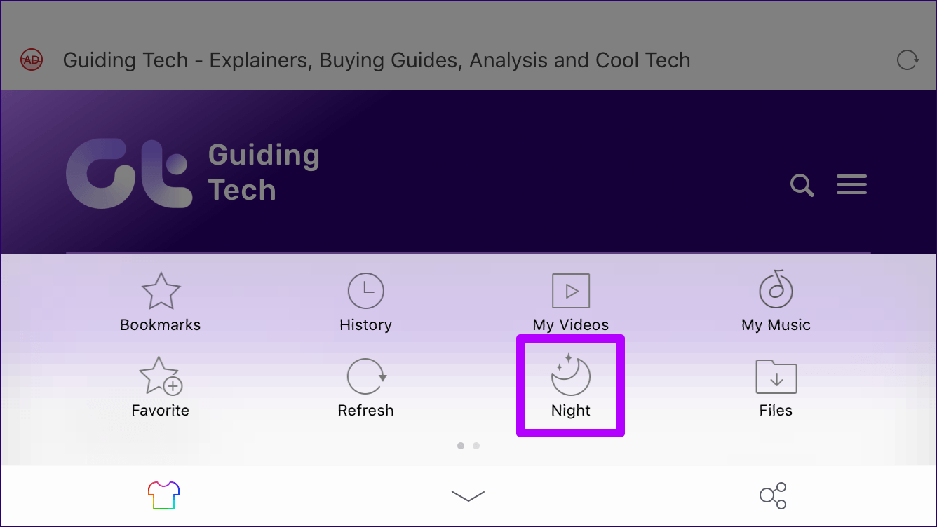 Название UC Browser может показаться знакомым, и это еще один браузер с хорошо реализованным темным режимом. Но в отличие от Firefox, тема и все веб-страницы становятся темными, если переключиться на встроенный ночной режим, который легко доступен через меню браузера UC.