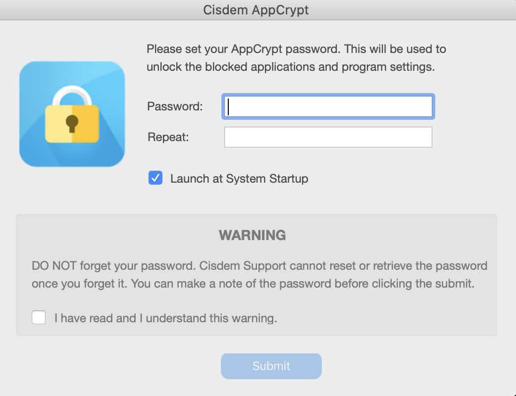 Во время первого запуска вам потребуется придумать и ввести пароль, который и будет использоваться в дальнейшем для запуска программ. Обязательно поставьте галочку «Launch at System Startup» чтобы после перезагрузки вашего компьютера она открывалась сразу.