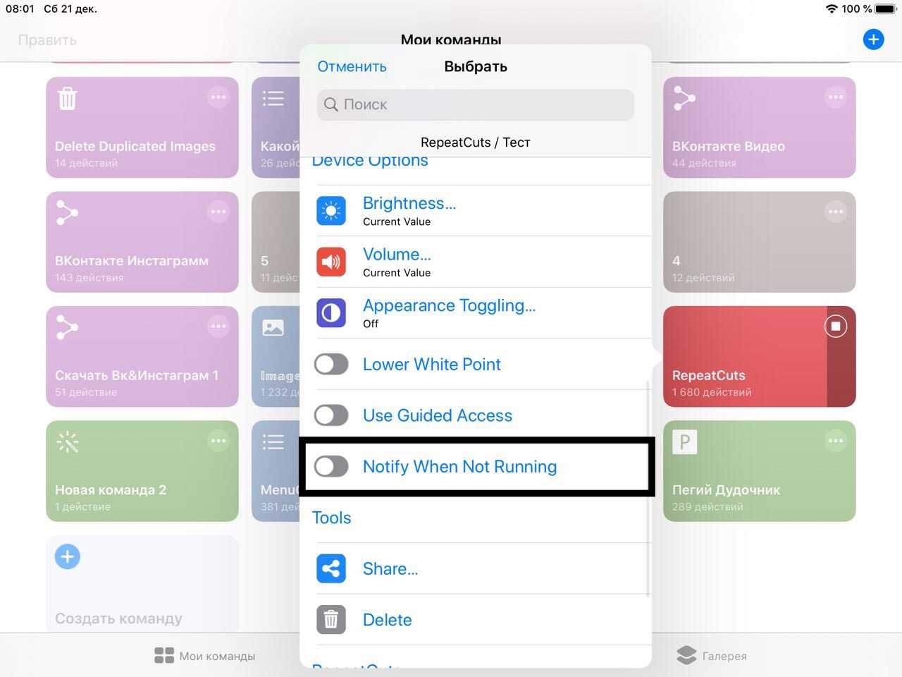 Эта команда для автоматизации процессов на iOS 13 уже поинтереснее, ведь она способна работать пока устройство выключено. По принципу действия она похожа на Cronios, т.к. циклично выполняет команду раз в какое-то время. Имеет те же недостатки: быстрый разряд аккумулятора и ненадёжность.