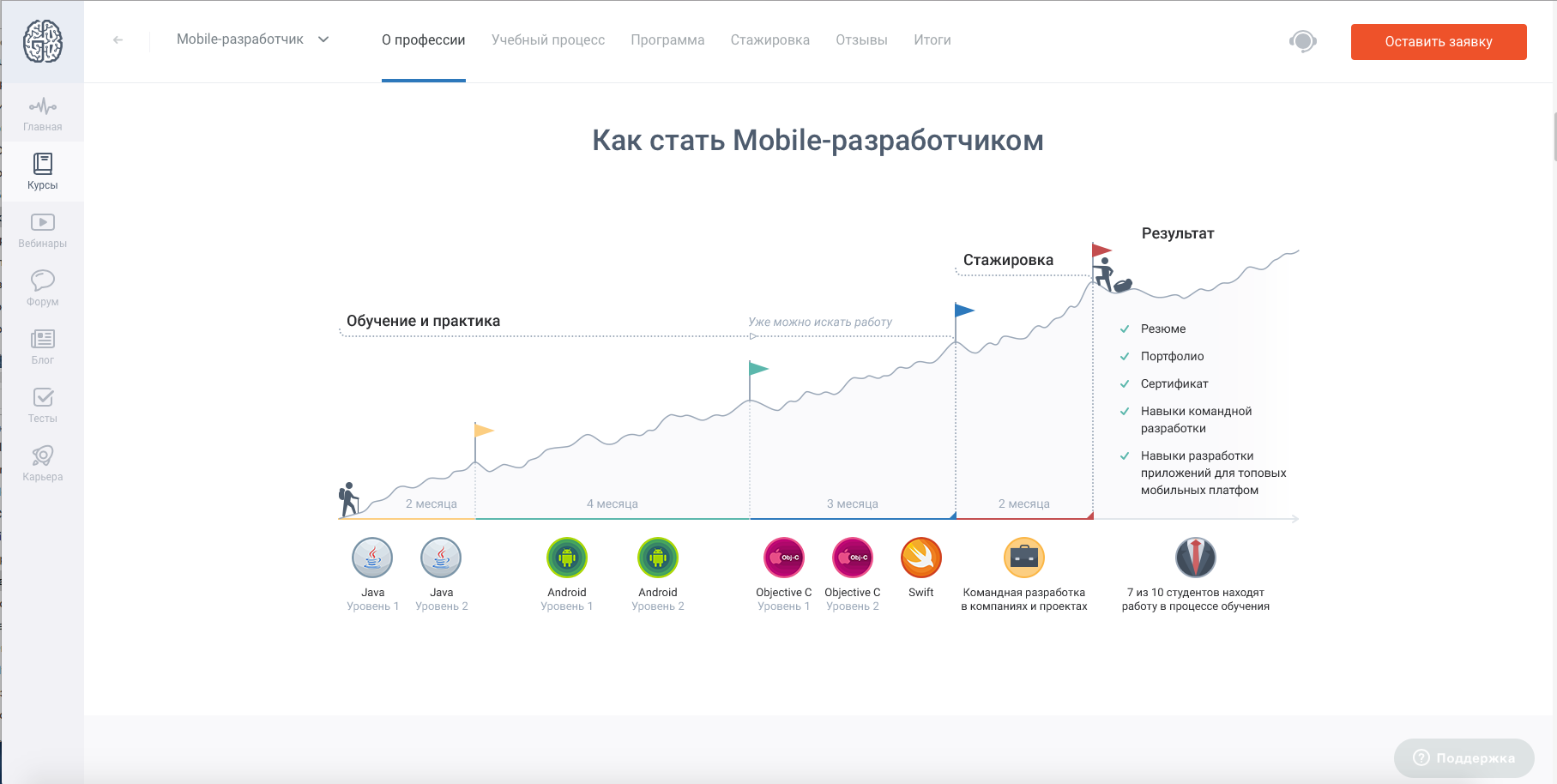 Это достойный курс: пройдя его, ты точно не потратишь время зря. Он начинается с двух подробных курсов по языку Java, затем следует изучение базового программирования под мобильную операционную систему Android. Далее курс по базам данных в общем и языку SQL в частности. Затем углубленный курс по разработке профессиональных приложений для Android. После этого вектор изучения перейдет в сторону Apple-систем: два подробных курса по языку Objective-C и полезный курс по Swift.