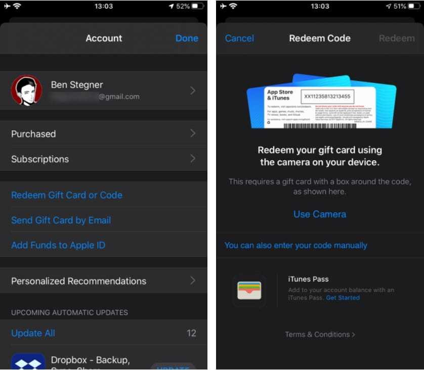 После перехода в «Настройки» достаточно выбрать пункт «Погасить подарочную карту или код» и в появившемся текстовом поле внести комбинацию, полученную в SMS после проведения транзакции на сайте Qiwi. Если код приобретался на сайте Plati.ru, то продавцы вместо кода часто выдают фотографию предоплаченной карты. Переписывать комбинацию вручную необязательно – Apple разрешает использовать камеру и отсканировать код, сэкономив время.