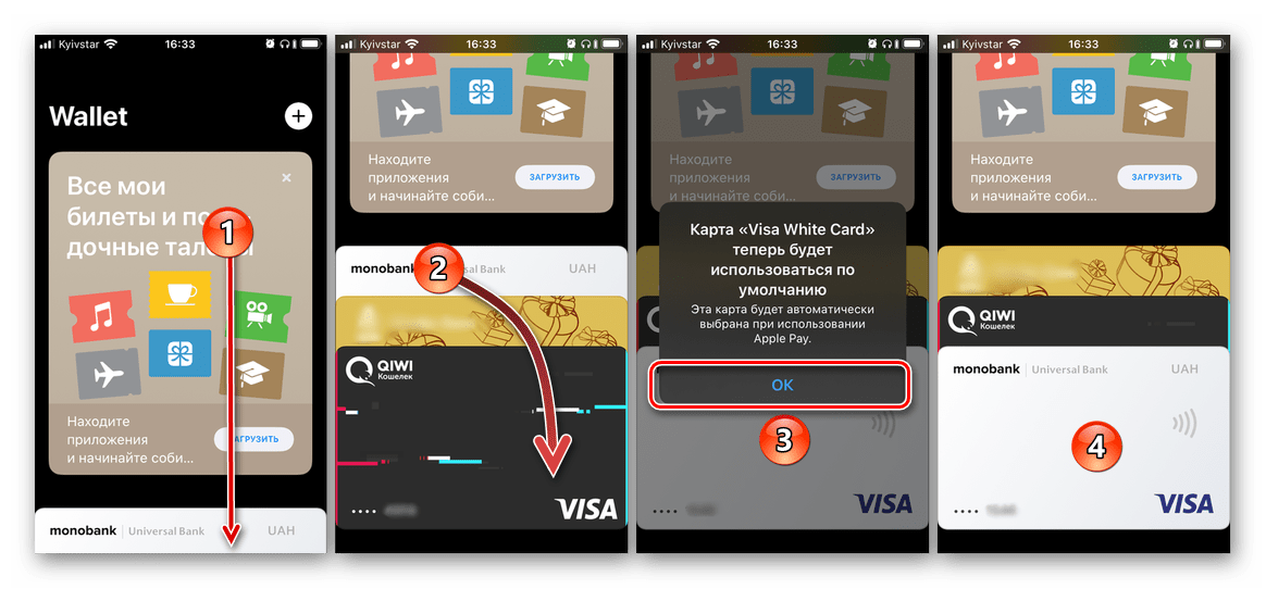Если вы хотите изменить карту, которая будет использоваться в качестве основного способа оплаты, запустите приложение, коснитесь пальцем «выглядывающей» снизу карты, и не отпуская, потяните ее вверх до появления всех карт. Нажмите на ту, которую хотите сделать основной, и поместите ее «на передний план». Согласитесь с тем, что она будет использоваться по умолчанию, тапнув «ОК» во всплывающем окне.
