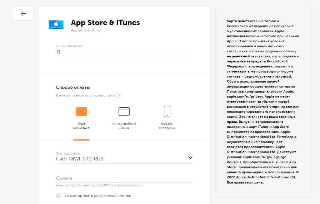 После оформления профиля и смены статуса достаточно подготовить новый платеж – ввести номер телефона (туда QIWI передаст код для погашения в Apple ID), сумму и выбрать способ проведения платежа. Карты, в том числе Visa, MasterCard и «Мир», принимаются в полной мере. Комиссия рассчитывается в индивидуальном порядке.
