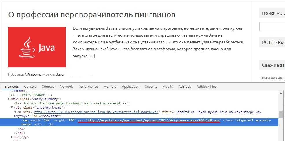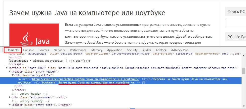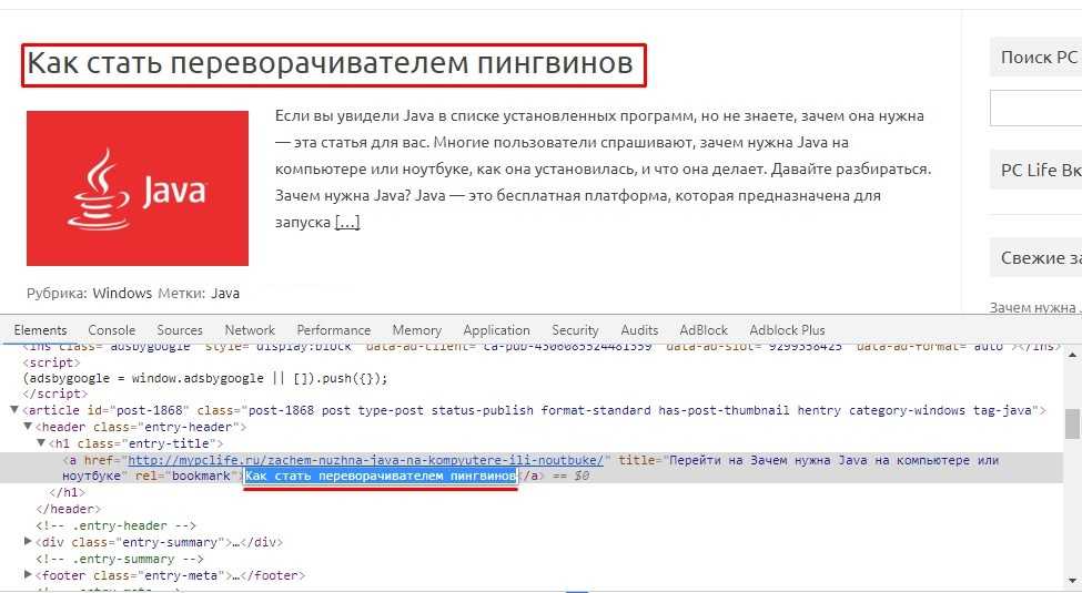 в правой — CSS код выделенного тега, в нашем случае тега h3 с классом .entry-title.