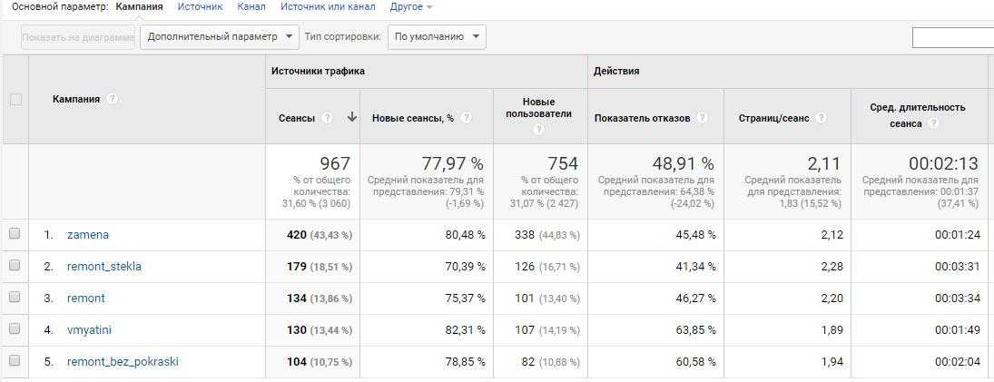 А посетители из кампании remont_stekla (2-я позиция) имеют наименьший показатель отказов и больше страниц просматривают на сайте.