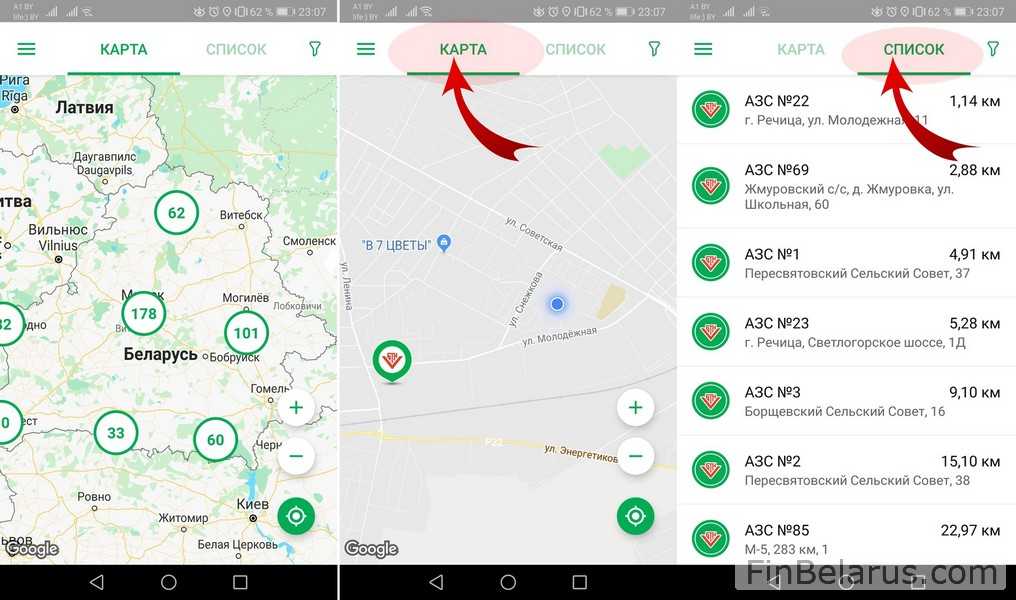 Приложение переходит в режим поиска нашего местоположения и ближайших АЗС. Просматривать автозаправки в доступном радиусе можно через карту или список.