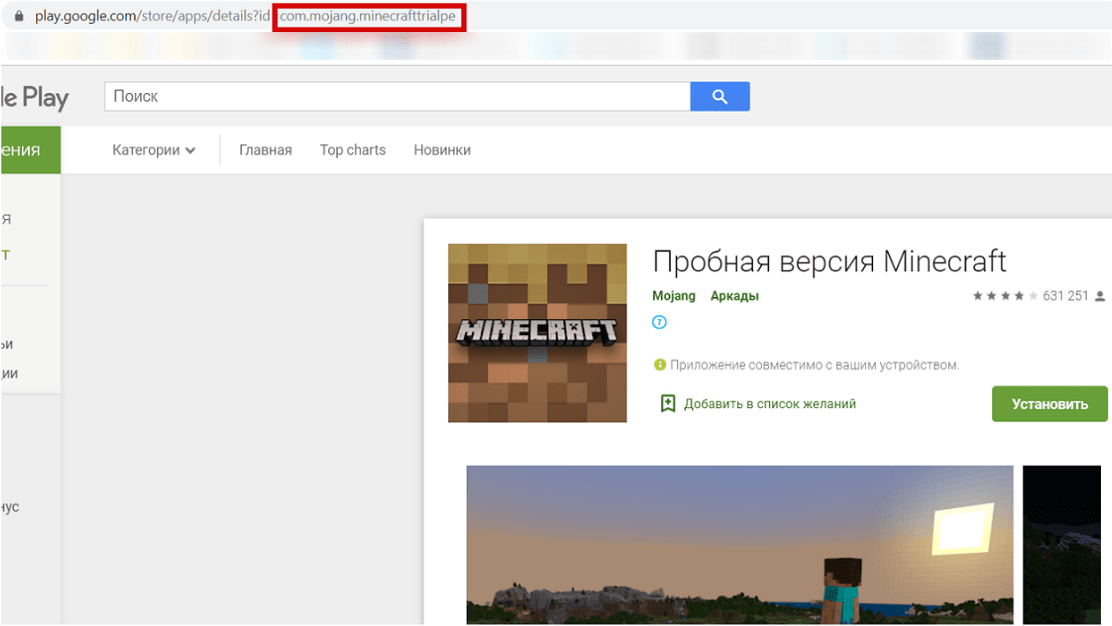 - Зайдя в Google Play, найдите нужное приложение и скопируйте адрес страницы, а также имя дополнения.