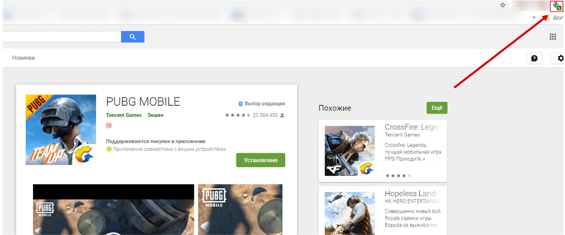 Находясь на официальном сайте Гугл Плей нажмите на значок расширения.