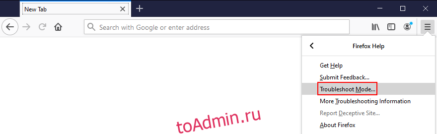 Запустите FirefoxНажмите кнопку ≡ гамбургер в правом верхнем углу.Откройте меню «Справка» и выберите «Режим устранения неполадок».
