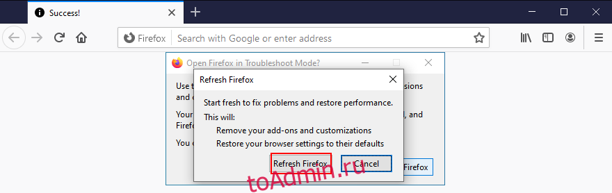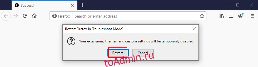 Когда вас попросят перезапустить Firefox в режиме устранения неполадок, нажмите «Перезагрузить».