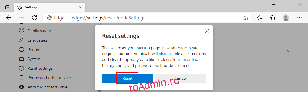 В качестве ярлыка вы можете перейти по адресу edge: // settings / resetProfileSettings.Перезапустить Edge