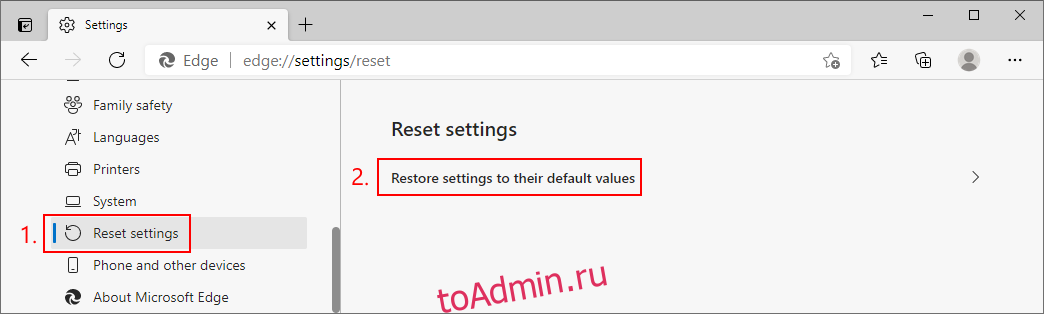 Перейдите в раздел Сброс настроек слева.Нажмите Восстановить настройки до значений по умолчанию.