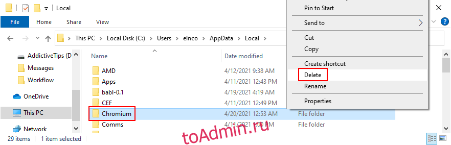 Нажмите клавишу Win + E, чтобы открыть проводник Windows.Введите% appdata% в адресной строке, чтобы открыть эту папку.Изучите папки Local и Roaming, чтобы найти и удалить все, что связано с Chromium или приложением, которое вы только что удалили.