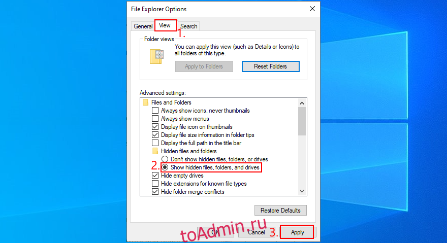 Перейдите на вкладку «Просмотр»Выберите Показать скрытые файлы, папки и диски.Нажмите Применить и выйти