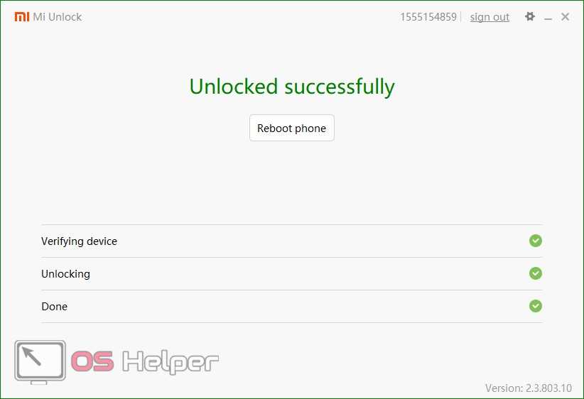 - Если все было сделано правильно, вы увидите надпись об успешной разблокировке. Можно отсоединять телефон и перезагружать его.
