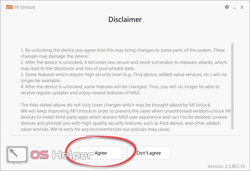 - Для этого скачайте и распакуйте программу MiFlashUnlock. Содержимое архива нужно извлечь на диск C: в папку без кириллических символов. Затем можно запускать утилиту и принимать лицензионное соглашение кликом по кнопке «I Agree».