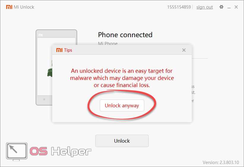 - Нас еще раз предупредят о том, что разблокированный девайс станет легкой добычей для воров или вирусов. Если это вас не пугает, жмем отмеченную на скриншоте кнопку.