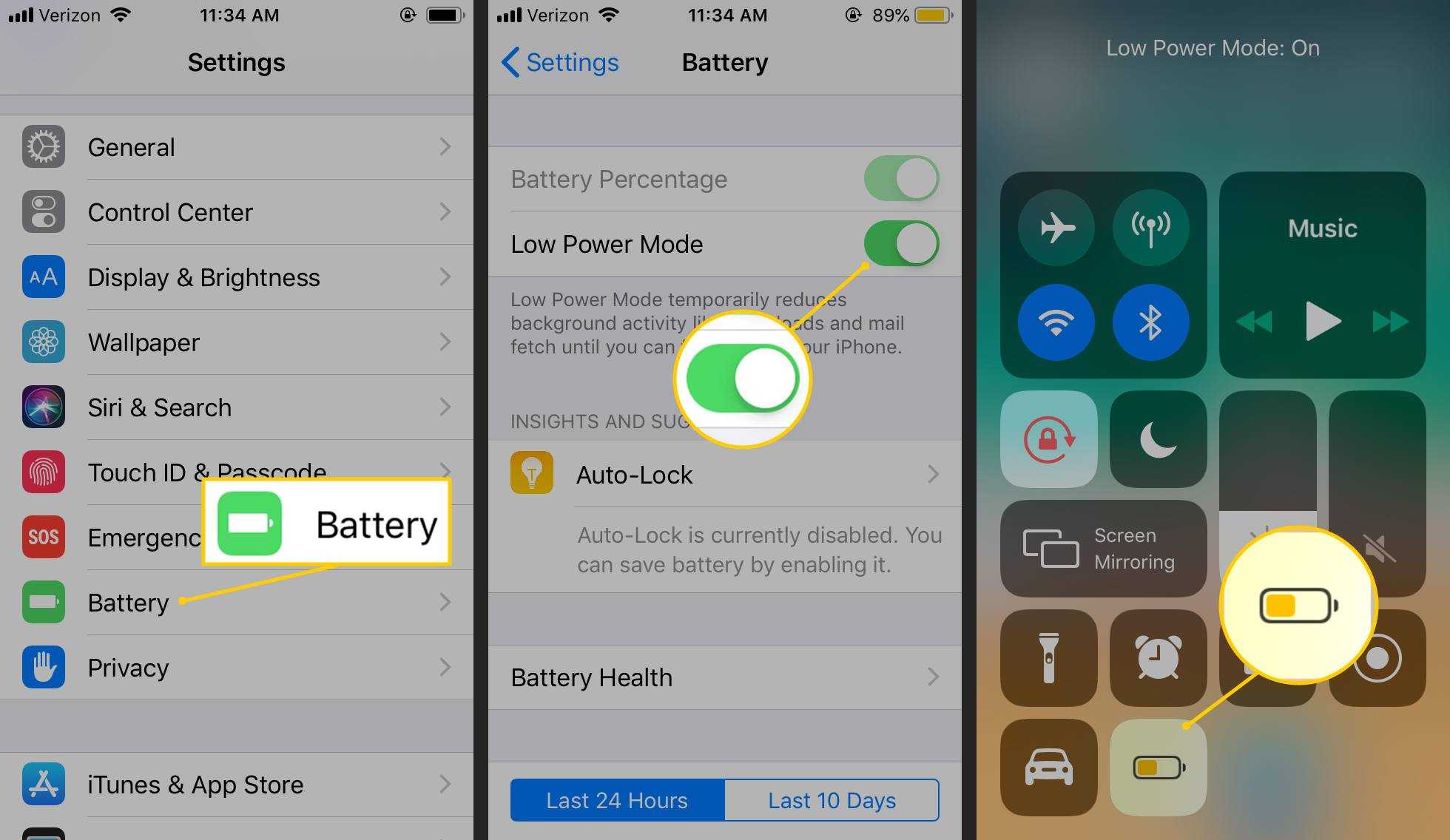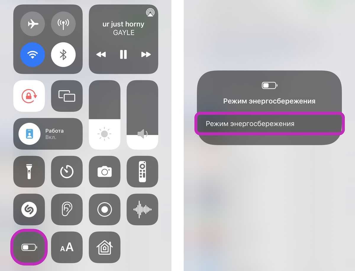Включите режим низкого энергопотребления в меню « Настройки» > « Аккумулятор» . Другой способ — через Центр управления; коснитесь значка аккумулятора, чтобы включить или отключить его.