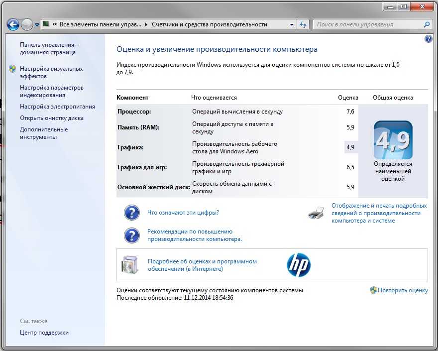 Можно увидеть и общее значение — финальную оценку системы. Данный показатель не представляет собой среднее арифметическое всех оценок (их сумму, поделенную на количество), а берет наименьшую оценку. Чаще всего наиболее производительным является жесткий диск, а самым слабым — процессор.