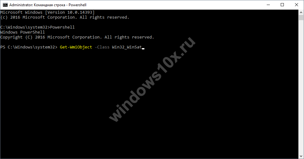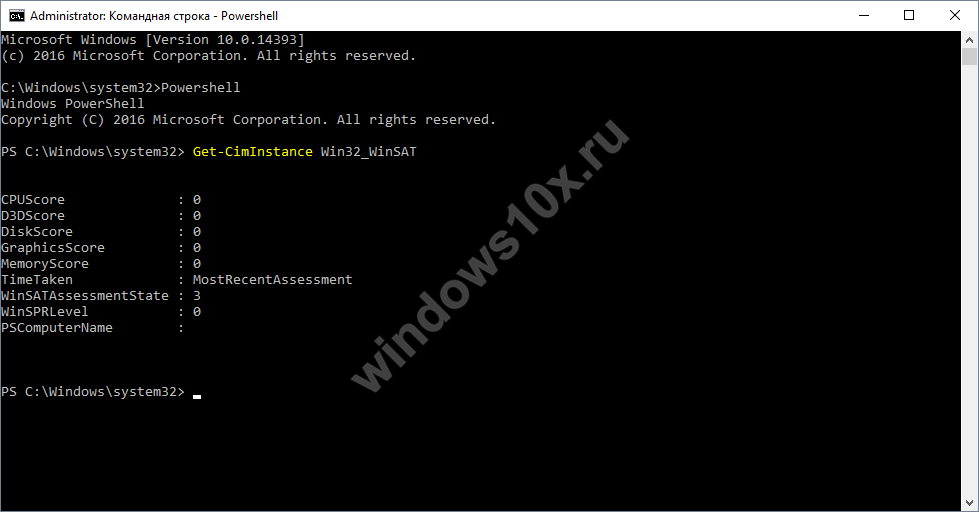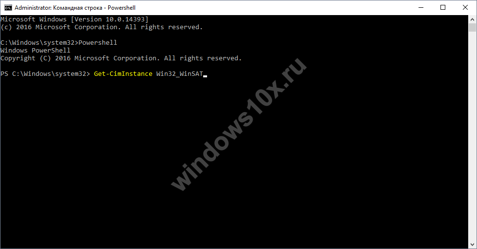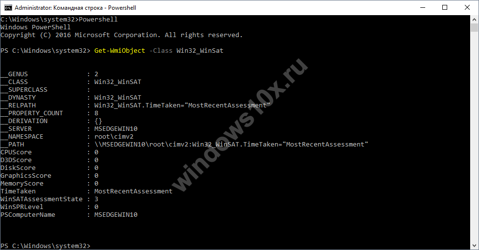 Не закрывая Powershell, испробуем еще один способ. Введите «Get-CimInstance Win32_WinSAT». Введя командлет (вызывает команду и сам объект, сочетает в себе существительное и глагол), мы получим уже имеющуюся оценку.