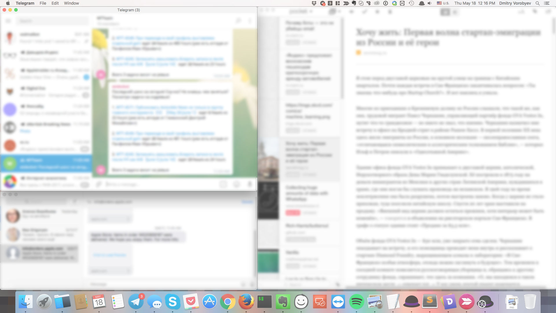Вот так организованы рабочие столы у меня: на первом iTunes и Mac App Store, на втором — почта, на третьем — Telegram и Twitter, на четвертом — Safari и Writer Pro, на пятом — Pixelmator. Мне этого достаточно, у вас их может быть больше или меньше. Вот моменты, которые вам стоит знать о рабочих столах: