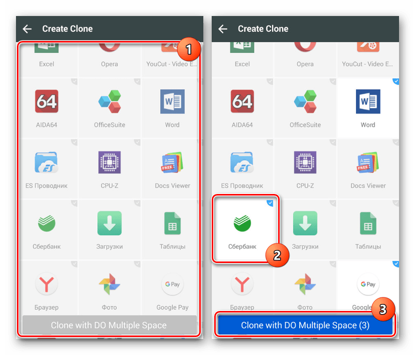 - Из общего списка установленных приложений выберите одно или несколько нужных. Для создания копии нажмите кнопку «Clone with DO Multiple Space».
