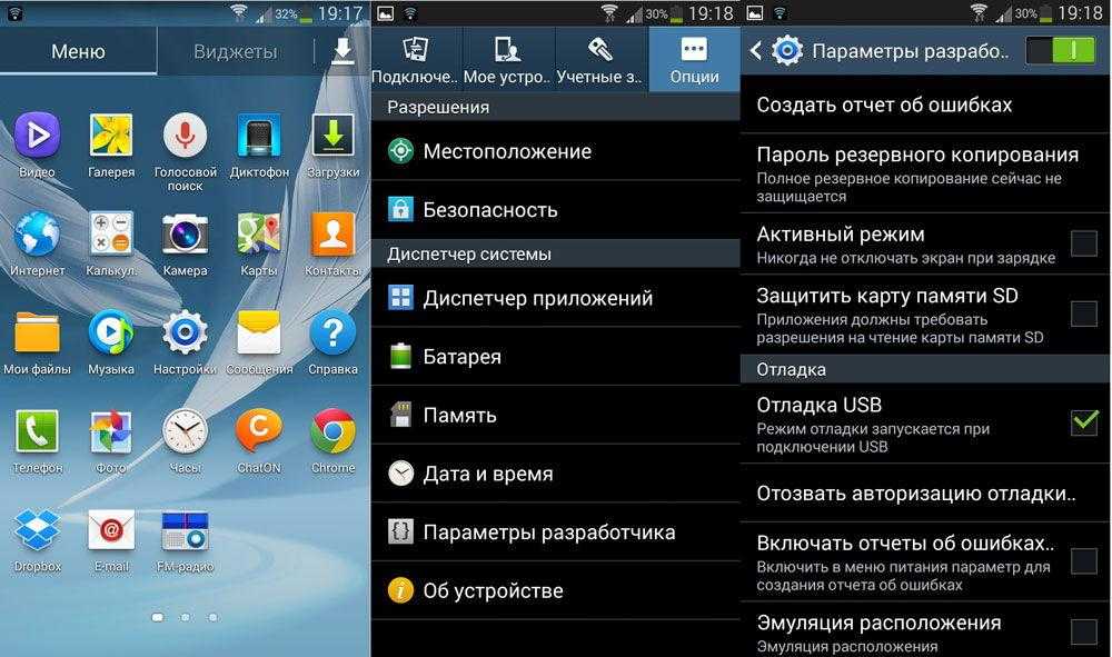 - В меню Настройки найдите пункт Отладка по USB и поставьте разрешающую галочку.