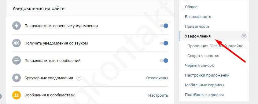 - Проверьте, включена ли опция получения уведомлений в виде звука. Для этого жмите на стрелку возле аватара, кликните «Настройки», перейдите «Уведомления», поставьте тумблер получения уведомления со звуком в правую сторону.